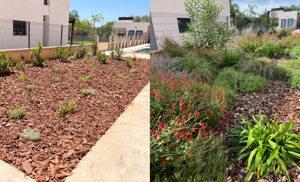 Las imágenes del antes y el después, muestran el crecimiento equilibrado del jardín y la rápida adaptación de las especies mediterráneas seleccionadas.